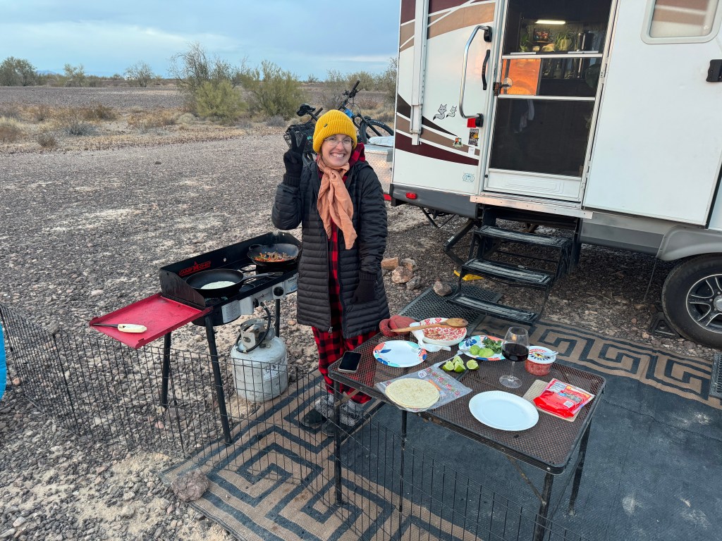 Managing our resources was a crucial part of our off-grid stay. Bobby took trips into town every few days to fill up our water jugs, which he used to top off the RV’s water tank. With the cooler temperatures, we didn’t need the AC at all, so that made it easier to conserve energy.