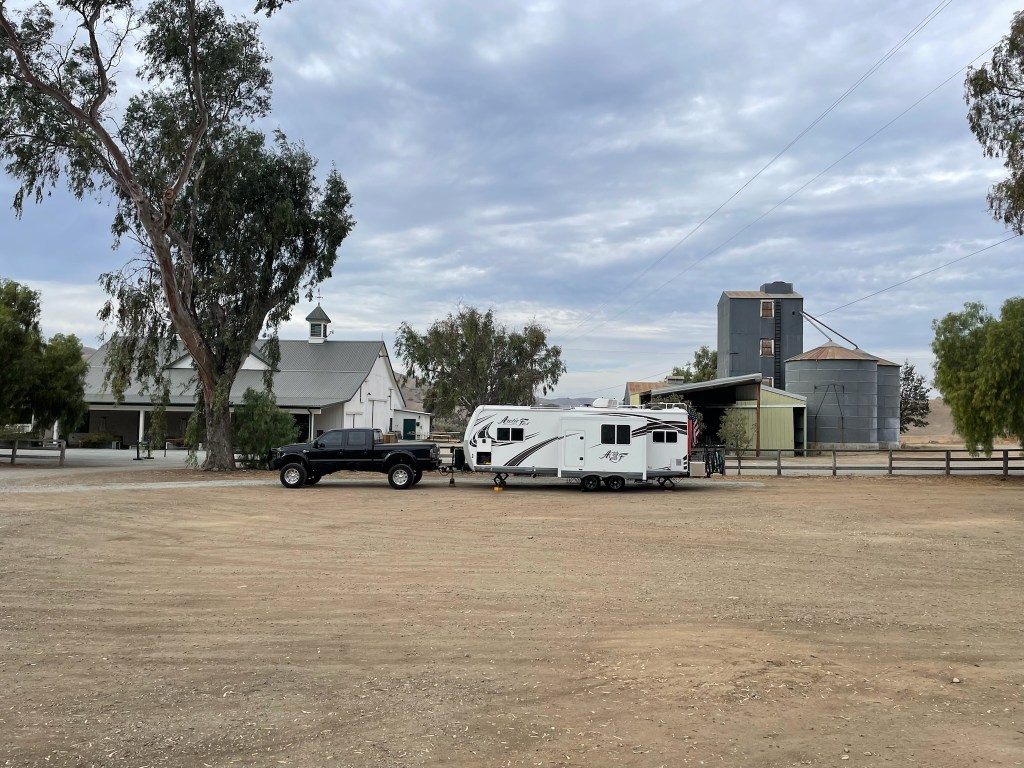 The welcome note had explicit directions on where we could park. We were Harvest Host lot #2 next to the Event Barn and the Mill & Silos. We were the only rig there so we picked a spot where we had a view from our front door. The lot is dirt with gravel. On this Halloween Monday, the ranch was very quiet with just a few workers milling around.